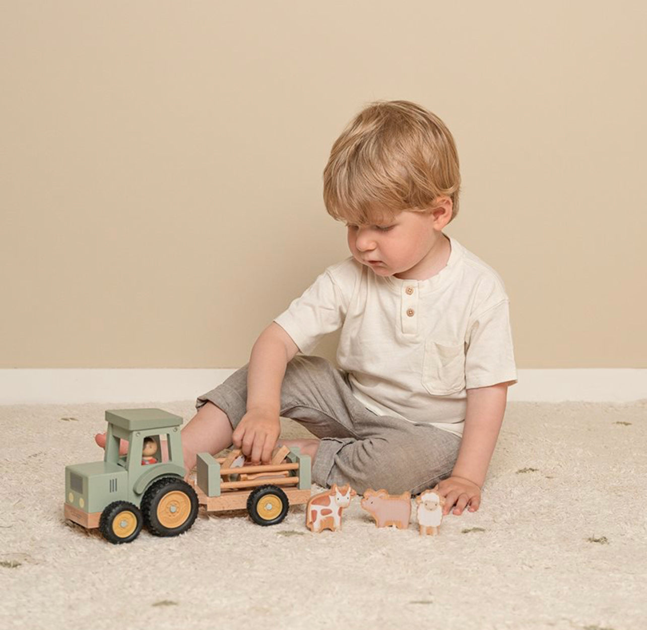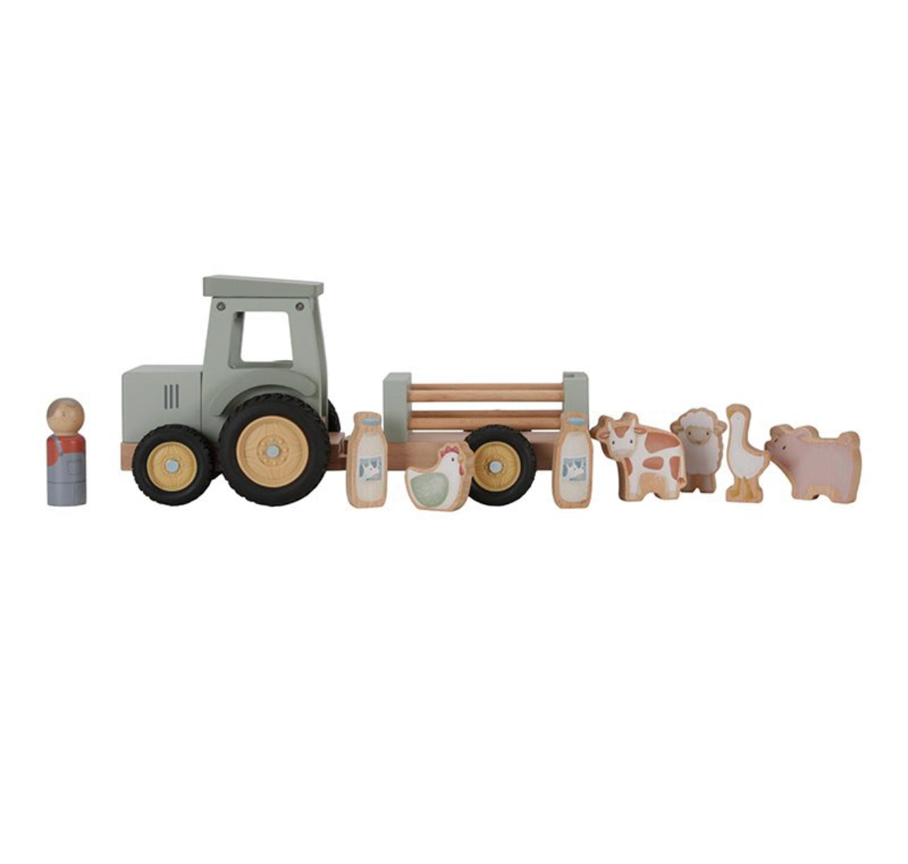 Ecco che arriva il trattore con il rimorchio colmo di animali della fattoria! Stimola il tuo bambino e la sua fantasia con questo gioco totalmente in legno! Carica il trattore con gli animali e tutto quello che serve da portare alla fattoria e il gioco e fatto.